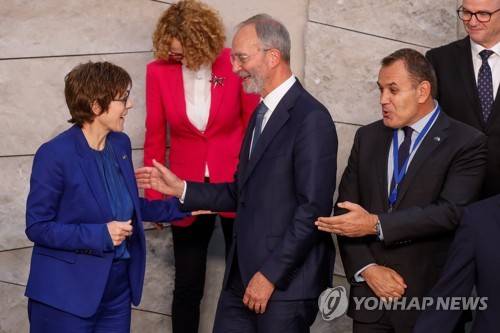 epa09536259 German Defense Minister Annegret Kramp-Karrenbauer (L), Dutch Defense Minister Henk Kamp (C) and Greece Defense Minister Nikolaos Panagiotopoulos during a family picture at a meeting of the NATO Ministers of Defence at the NATO headquarters in Brussels, Belgium, 21 October 2021. The meeting of the NATO Ministers of Defence takes place on 21 and 22 October. EPA/STEPHANIE LECOCQ