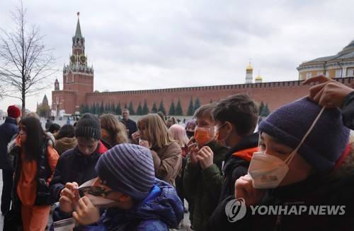 epa09536274 Tourists wearing protective face masks walk at the Red Square during coronavirus pandemic in Moscow, Russia, 21 October 2021. Russian President Putin approved a non-working week from 30 October to 07 November in Russia to curb fast spreading coronavirus infection. EPA/MAXIM SHIPENKOV