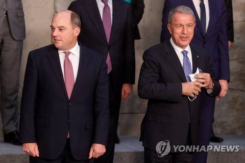 epa09536270 Britain's Defence Secretary Ben Wallace (L) and Turkish Defence Minister Hulusi Akar during a family picture during a meeting of the NATO Ministers of Defence at the NATO headquarter in Brussels, Belgium, 21 October 2021. The meeting of the NATO Ministers of Defence will take place on 21 and 22 October 2021. EPA/STEPHANIE LECOCQ