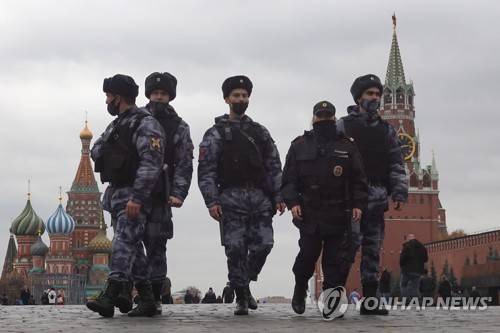 epa09536278 Police officers wearing protective face masks patrol the Red Square during coronavirus pandemic in Moscow, Russia, 21 October 2021. Russian President Putin approved a non-working week from 30 October to 07 November in Russia to curb fast spreading coronavirus infection. EPA/MAXIM SHIPENKOV