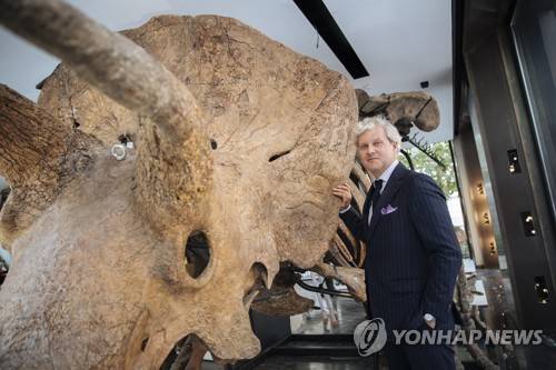 Auctioneer Alexandre Giquello poses in front of Big John, the largest known triceratops skeleton, as he is being assembled in a showroom in Paris, Tuesday, Aug. 31, 2021. Big John, the world's biggest triceratops skeleton, over 66 million years old, was sold for 5.5 million euros ($6.4 million) Thursday, Oct. 21, 2021 at a Paris auction house. (AP Photo/Lewis Joly)