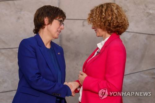 epa09536281 German Defense Minister Annegret Kramp-Karrenbauer (L) and Minister of Defence of the Republic of North Macedonia Radmila Shekerinska Jankovska (R) during a family picture during a meeting of the NATO Ministers of Defence at the NATO headquarter in Brussels, Belgium, 21 October 2021. The meeting of the NATO Ministers of Defence will take place on 21 and 22 October 2021. EPA/STEPHANIE LECOCQ