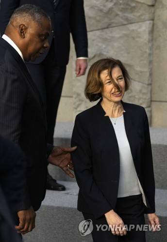 United States Defense Secretary Lloyd J. Austin III, left, holds the arm of French Defense Minister Florence Parly as they step off the podium during a group photo of NATO defense ministers at NATO headquarters in Brussels, Thursday, Oct. 21, 2021. NATO defense ministers gather for their fall meeting to assess the fallout of Moscow's closure of its mission to the alliance and an overall worsening of relations with Moscow. (AP Photo/Virginia Mayo)