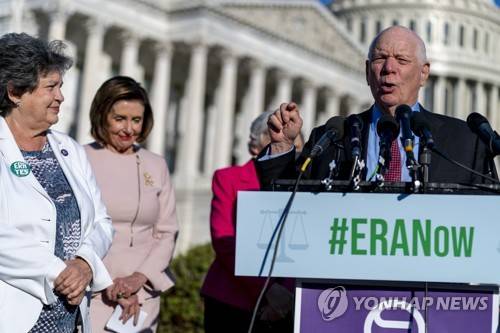 Sen. Ben Cardin, D-Md., right, accompanied by House Speaker Nancy Pelosi of Calif., second from left, and Rep. Lois Frankel, D-Fla., left, speaks in support for the Equal Rights Amendment to be added to the U.S. Constitution at a news conference on Capitol Hill in Washington, Thursday, Oct. 21, 2021. (AP Photo/Andrew Harnik)