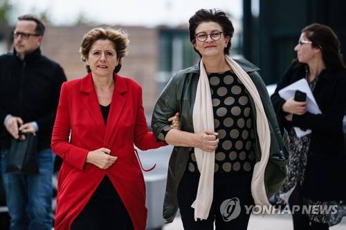 epa09536300 Social Democratic Party (SPD) co-chairwoman Saskia Esken (R) and Rhineland-Palatinate State Premier Malu Dreyer of the Social Democratic Party (SPD) arrive for coalition talks between the Free Democratic Party (FDP), The Greens (Buendnis 90/Die Gruenen) and the Social Democratic Party (SPD), in Berlin, Germany, 21 October 2021. Greens, SPD and FDP meet in order to form a government coalition after Germany's 26 September parliamentary election. EPA/CLEMENS BILAN