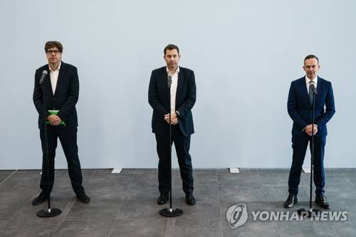 epa09536329 (L-R) Federal Managing Director of the federal Alliance 90/The Greens party Michael Kellner, Social Democratic Party (SPD) Secretary General Lars Klingbeil and Secretary General of the Free Democratic Party (FDP) Volker Wissing talk to media during the beginning of coalition talks between the Free Democratic Party (FDP), The Greens (Buendnis 90/Die Gruenen) and the Social Democratic Party (SPD), in Berlin, Germany, 21 October 2021. Greens, SPD and FDP meet in order to form a government coalition after Germany's 26 September parliamentary election. EPA/CLEMENS BILAN