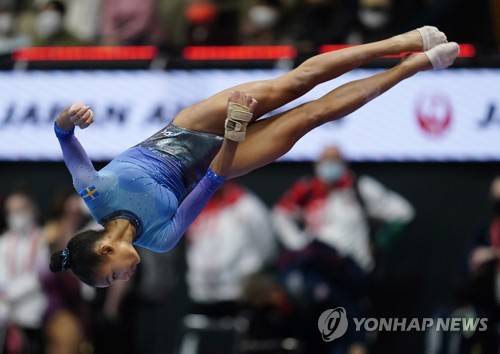 epa09536331 Jennifer Williams of Sweden performs in the floor event during the Women's All-Around Final at the 50th FIG Artistic Gymnastics World Championships in? Kitakyushu, Japan, 21 October 2021. EPA/KIMIMASA MAYAMA