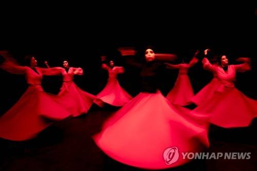 Khishtan art group perform the Sama dance, or a Sufi dance, at a theater hall in downtown Tehran, Iran, Friday, Oct. 15, 2021. Sama is a popular form of worship in Sufism. (AP Photo/Ebrahim Noroozi)