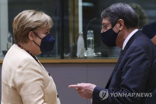 German Chancellor Angela Merkel, left, talks to Cyprus' President Nicos Anastasiades prior a round table meeting at an EU summit in Brussels, Thursday, Oct. 21, 2021. European Union leaders head into a standoff between Poland and most of the other EU member nations over the rule of law in the eastern member state. Other issues for the 27 EU leaders include climate change, the energy crisis, COVID-19 developments and migration. (Yves Herman, Pool Photo via AP) POOL PHOTO