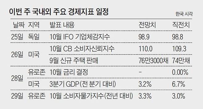 미국이 3분기 경제성장률을 다음 주 발표한다. 28일 발표 예정인 미국의 3분기 GDP(국내총생산)는 전 분기 대비 3.2% 성장했을 것으로 예측된다. 2분기 성장률(6.7%)과 비교하면 절반 이하다. 같은 날 유럽중앙은행(ECB)은 기준금리를 결정한다. 최근 뉴질랜드, 폴란드, 루마니아, 싱가포르가 잇따라 기준금리를 인상한 가운데 2016년 3월 이후 제로(0) 금리를 유지 중인 ECB가 어떤 입장을 내놓을지가 관심사다. ECB는 여전히 인플레이션이 일시적이라는 입장이어서 금리 동결 전망에 무게가 쏠린다. 26일에는 콘퍼런스보드 소비자신뢰지수 10월치가 발표된다. 미국 소비자들의 체감경기를 나타내는 지표로, 전달(109.3)보다 약간 상승할 것으로 시장은 전망한다. 독일 기업들의 경기 신뢰도를 나타내는 10월 Ifo 기업체감지수는 25일 발표되는데, 9월보다 소폭 오를 것으로 전망된다.