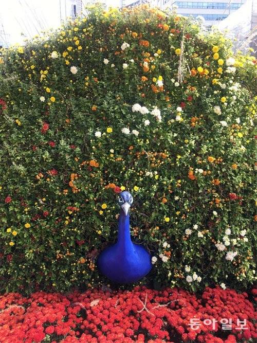 가을 국화 축제에 초대받은 파랑 공작이 국화로 꾸민 꽁지 깃털을 활짝 펼쳤습니다. 진짜 수컷 공작이 바르르 떨면서 시샘할 만큼 화려하지 않나요?