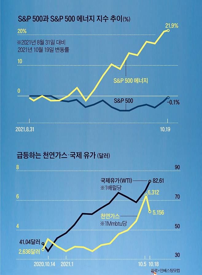 최근 중국발(發) 리스크와 인플레이션, 미국의 테이퍼링(양적 완화 축소) 예고 등 각종 악재로 출렁이는 세계 증시 속에도 에너지 관련주는 상승세를 이어가고 있다. 19일 기준 미국을 대표하는 주가 지수인 S&P 500은 9월 초 대비 0.1% 하락했으나, S&P 500 에너지 지수는 같은 기간 21.9% 올랐다.