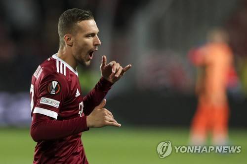 epa09537171 Lukas Haraslin of Sparta celebrates after scoring during the UEFA Europa League soccer match between Sparta Prague and Olympique Lyon in Prague, Czech Republic, 21 October 2021. EPA/MARTIN DIVISEK
