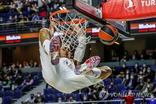 epa09537230 Real Madrid's guard Alberto Abalde dunks during the Euroleague basketball game between Real Madrid and Fenerbahce Istanbul at Wizink Center in Madrid, Spain, 21 October 2021. EPA/JUANJO MARTIN