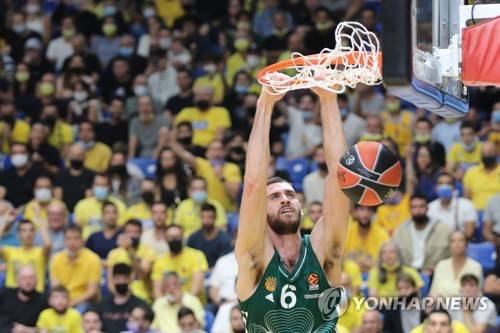 epa09537295 Georgios Papagiannis of Panathinaikos dunks during the Euroleague basketball match Maccabi Tel Aviv vs Panathinaikos in Tel Aviv, Israel, 21 October 2021. EPA/ABIR SULTAN