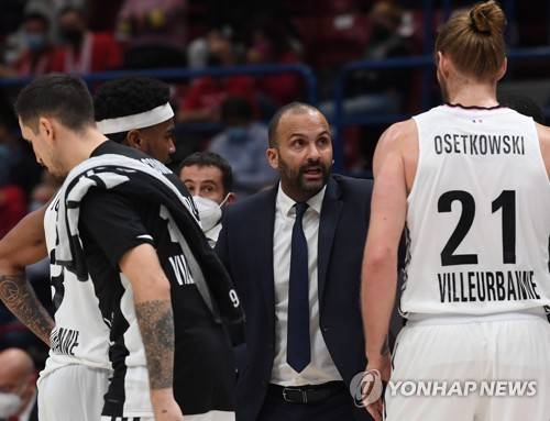 epa09537356 Asvel Lyon-Villeurbanne's head coach Terence Jonathan 'TJ' Parker (C) gives instructions during the Euroleague basketball match between Armani Exchange Milan and Asvel Lyon-Villeurbanne at the Assago Forum, Milan, Italy, 21 October 2021. EPA/DANIEL DAL ZENNARO