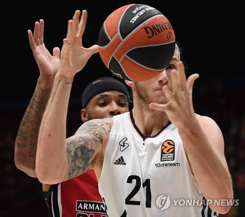 epa09537361 Asvel Lyon-Villeurbanne Dylan Osetkowski (front) controls the balla past Armani Exchange Milan's Malcom Delaney during the Euroleague basketball match between Armani Exchange Milan and Asvel Lyon-Villeurbanne at the Assago Forum, Milan, Italy, 21 October 2021. EPA/DANIEL DAL ZENNARO