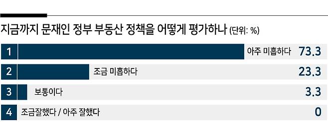 헤럴드경제가 이달 20~21일 부동산 전문가 30인을 대상으로 문재인 정부 부동산 정책을 어떻게 평가하는지 물은 결과 “아주 미흡하다”는 응답 비중이 73.3%로 가장 컸다. 이어 “조금 미흡하다”는 답변이 23.3%였다. “잘했다”라고 답한 전문가는 없었다.