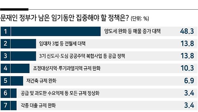 문재인 정부가 남은 임기 동안 집중해야 할 정책으로는 "양도세 완화 등 매물 증가 대책"이라고 답한 전문가가 48.3%로 절반에 달했다.