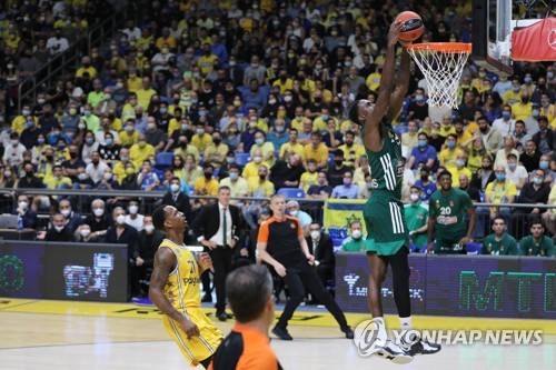 epa09537514 Okaro White of Panathinaikos dunks during the Euroleague basketball match Maccabi Tel Aviv vs Panathinaikos in Tel Aviv, Israel, 21 October 2021. EPA/ABIR SULTAN