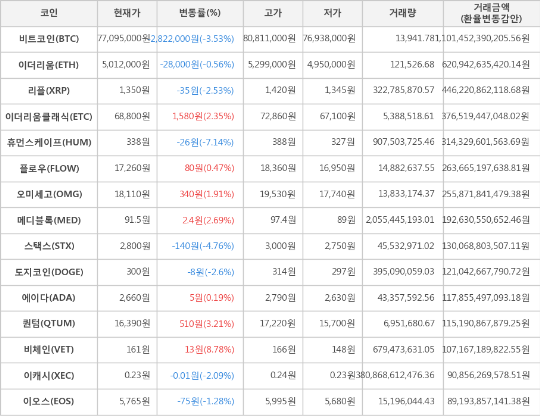 현재 암호화폐 거래소 "업비트"에 따르면 가상화폐 대장 격인 비트코인의 시세는 전일 대비 -2,822,000원(-3.53%) 하락한 77,095,000원에 거래되고 있다.