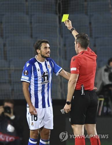 epa09537612 Real Sociedad's Ander Guevara (L) gets a yellow card during the UEFA Europa League group stage soccer match between Sturm Graz and Real Sociedad in Graz, Austria, 21 October 2021. EPA/CHRISTIAN BRUNA