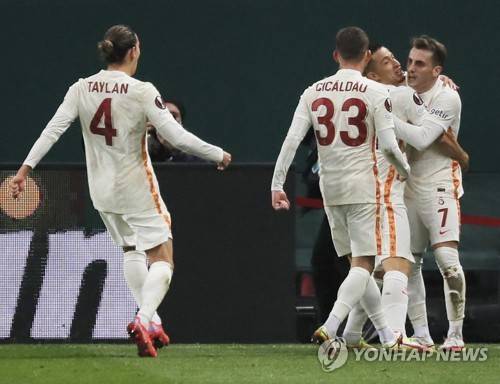 epa09537678 Kerem Akturkoglu (R) of Galatasaray celebrates with teammates after scoring the 1-0 lead during the UEFA Europa League group E soccer match between FK Lokomotiv Moscow and Galatasaray Istanbul at the Lokomotiv Stadium in Moscow, Russia, 21 October 2021. EPA/SERGEI ILNITSKY