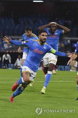 epa09537686 Napoli?s forward Lorenzo Insigne jubilates afters scoring the opening goal duing the UEFA Europa League group C soccer match between SSC Napoli and Legia Warszaw at the Diego Armando Maradona Stadium in Naples, Italy, 21 October 2021. EPA/CIRO FUSCO