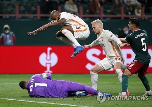 epa09537709 (L-R) Goalkeeper Fernando Muslera, Marcao and Victor Nelsson of Galatasaray in action against Konstantin Maradishvili of Lokomotiv Moscow during the UEFA Europa League group E soccer match between FK Lokomotiv Moscow and Galatasaray Istanbul at the Lokomotiv Stadium in Moscow, Russia, 21 October 2021. EPA/SERGEI ILNITSKY