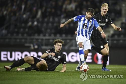 epa09537708 Real Sociedad's Portu (C) in action against GrazÕs David Affengruber (L) during the UEFA Europa League group stage soccer match between Sturm Graz and Real Sociedad in Graz, Austria, 21 October 2021. EPA/CHRISTIAN BRUNA
