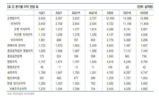 정태준 유안타증권 연구원은 "3분기 연결 이익은 1조2979억원으로 당사 추정치 1조2179억원과 컨센서스 1조2080억원을 상회, 우려와 달리 NIM과 대출성장률이 모두 견조한 상승세를 보임에 따라 기대 이상의 이자이익을 달성한 가운데 충당금 환입 영향으로 자산건전성도 전분기대비 추가 개선됐다"면서 "주요 특이요인으로는 은행 법인세 환입 약 180억원과 거액 대손충당금 환입 약 170억원, 해외자회사 잔여지분 조기인수 관련 기타영업이익 약 140억원 등이 있다"고 설명했다.