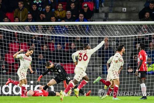 epa09537711 Monaco players (white) celebrate their second goal during the UEFA Europa League group B soccer match between PSV Eindhoven and AS Monaco at Phillips Stadium in Eindhoven, Netherlands, 21 October 2021. EPA/OLAF KRAAK