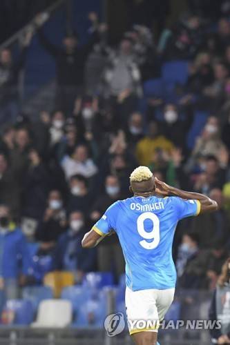 epa09537758 Napoli?s forward Victor Osimhen celebrates after scoring the 2-0 lead duing the UEFA Europa League group C soccer match between SSC Napoli and Legia Warszaw at the Diego Armando Maradona Stadium in Naples, Italy, 21 October 2021. EPA/CIRO FUSCO