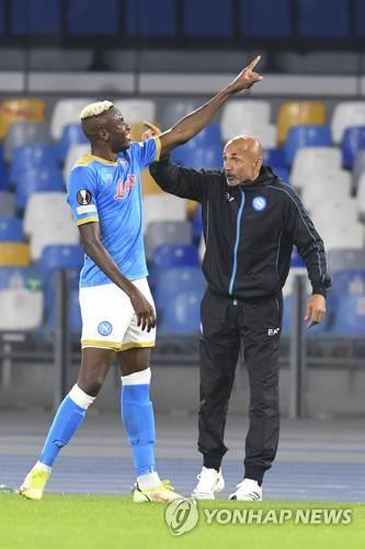 epa09537778 Napoli?s forward Victor Osimhen celebrates with his coach Luciano Spalletti after scoring the 2-0 lead during the UEFA Europa League group C soccer match between SSC Napoli and Legia Warszaw at the Diego Armando Maradona Stadium in Naples, Italy, 21 October 2021. EPA/CIRO FUSCO