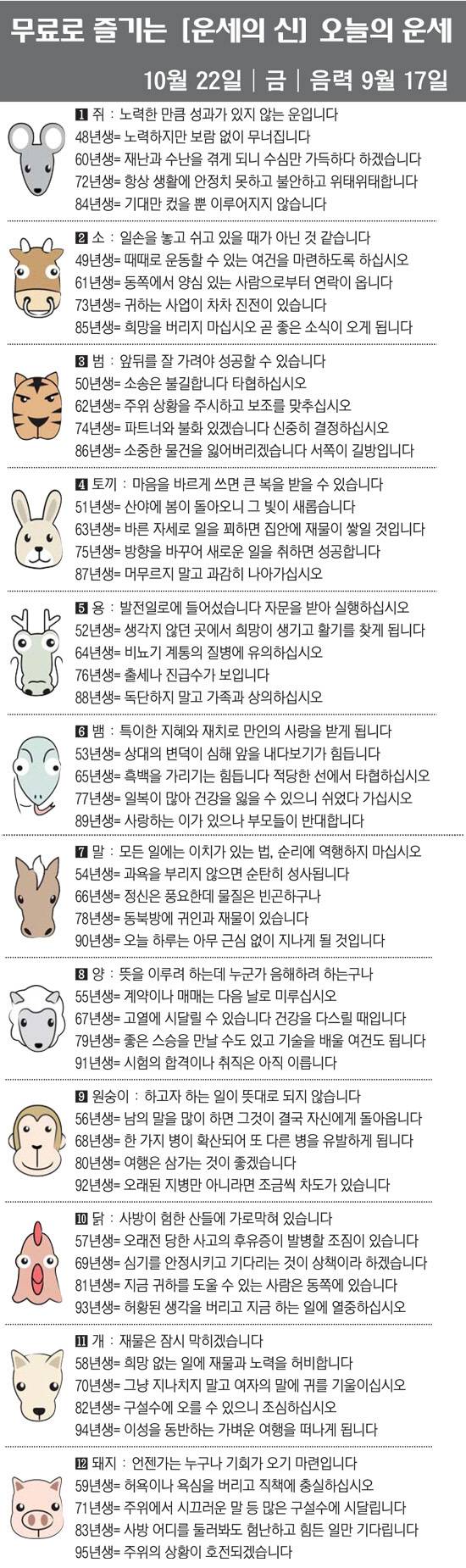 스포츠조선에서 제공하는 10월 22일(음력 9월 17일) 오늘의 운세입니다.