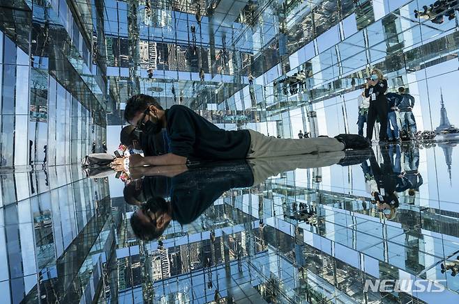 [뉴욕=AP/뉴시스] 21일(현지시간) 뉴욕 맨해튼 42번가에서 '원 밴더빌트 써밋' 전망대가 개장해 방문객들이 엠파이어 스테이트 빌딩이 뒤로 보이는 가운데 사방이 반사되는 유리 바닥에 엎드려 사진을 찍고 있다. 높이 427m의 뉴욕 원 밴더빌트 타워 내 305m 높이에 있는 이 전망대 바닥은 메디슨 애비뉴가 아찔하게 내려다보이는 유리로 되어 있고 크라이슬러 빌딩, 엠파이어 스테이트 빌딩, 센트럴 파크 등이 보인다. 2021.10.22.