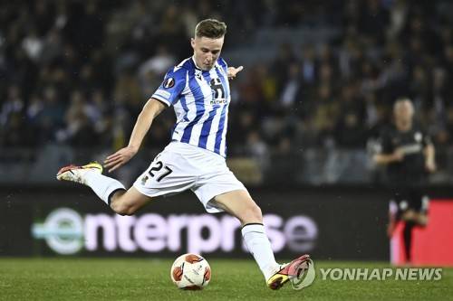 epa09537783 Real Sociedad's Benat Turrientes in action during the UEFA Europa League group stage soccer match between Sturm Graz and Real Sociedad in Graz, Austria, 21 October 2021. EPA/CHRISTIAN BRUNA