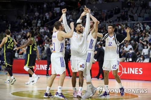 epa09537786 Real Madrid players celebrate the victory at the end of the Euroleague basketball game between Real Madrid and Fenerbahce Istanbul at Wizink Center in Madrid, Spain, 21 October 2021. EPA/JUANJO MARTIN