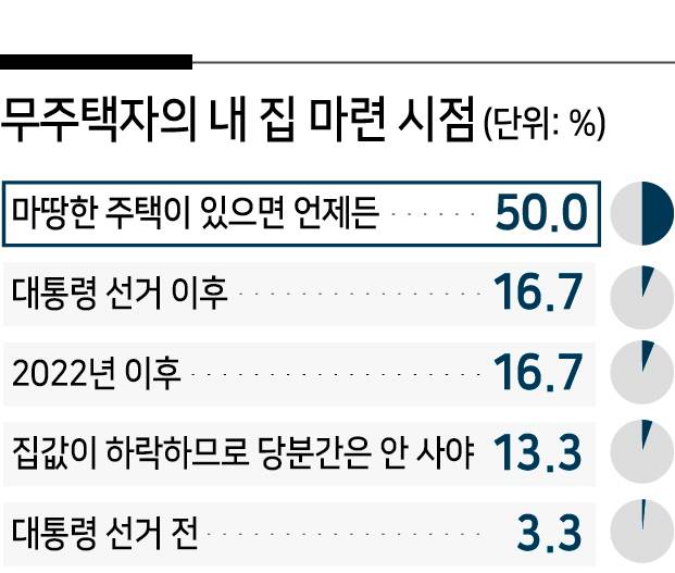 ▶“자금 여력 있다면 내 집은 사라”=헤럴드경제가 이달 20~21일 부동산전문가 30인에게 무주택자의 주택 마련시기에 대해 설문한 결과, 전체의 50%인 15명이 ‘마땅한 주택이 있으면 언제든’이라고 답했다. 내년 3월 치러지는 ‘대통령선거 이후’가 적절하다는 응답과 ‘2022년 이후’라는 응답이 각각 16.7%였다. 반면 ‘집값이 하락하므로 당분간 안 사는 게 낫다’는 의견도 13.3% 나왔다.