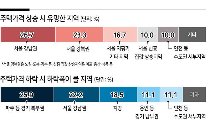이 밖에 ‘용인 등 경기 남부권’과 ‘인천 등 수도권 서부지역’이라는 답변이 각각 11.1%였고 ‘서울 강북권’과 ‘서울 도심권’을 지목한 전문가도 각각 1명이었다.