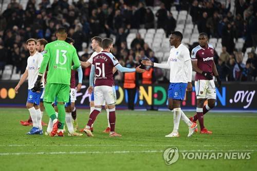 epa09537857 Players shake hands after the UEFA Europa League group H soccer match between West Ham United and KRC Genk at the London Stadium in London, Britain 21 October 2021. EPA/VICKIE FLORES