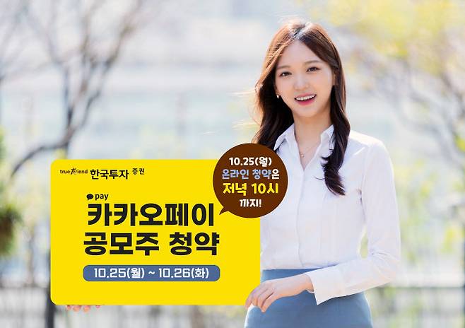 한국투자증권은 10월 25~26일 카카오페이 공모주 일반청약을 진행한다. 온라인 청약 시간은 25일 10~22시, 26일 10~16시다. 투자자 편의를 위해 청약 첫날 마감 시간을 오후 4시에서 오후 10시로 연장했다.