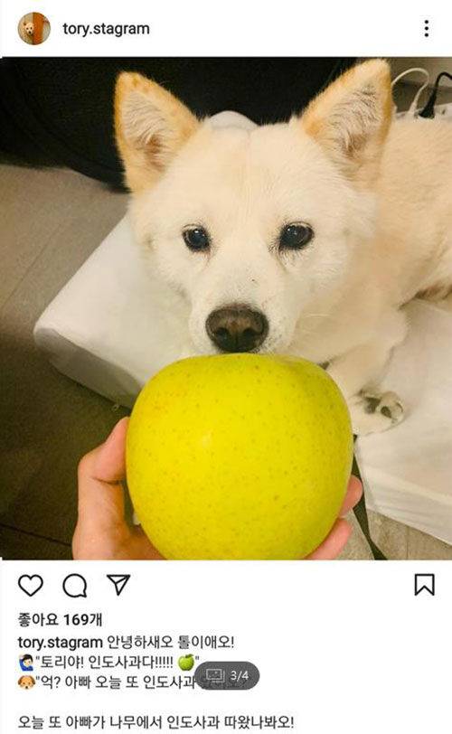 윤 전 총장의 반려견 SNS '토리스타그램'에는 어제(21일) 밤 반려견 '토리'에게 '인도사과'를 주는 장면을 찍은 사진과 함께 "아빠를 닮아서 인도사과를 좋아해요"라는 글이 올라왔다가 삭제됐습니다.