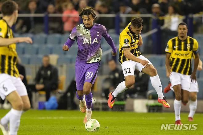 [아른험=AP/뉴시스] 토트넘 홋스퍼의 델리 알리가 21일(현지시간) 네덜란드 아른험의 헬레도머 경기장에서 열린 2021~22시즌 유로파 콘퍼런스리그 조별리그 G조 3차전 비테세(네덜란드)를 상대로 공을 다투고 있다. 손흥민과 해리 케인 등 주전이 빠진 토트넘은 비테세에 0-1로 패해 조 3위로 밀리며 탈락 위기에 몰렸다. 2021.10.22.