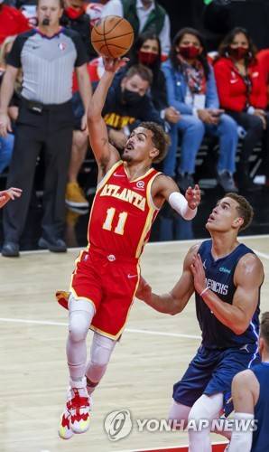 epa09538056 Atlanta Hawks guard Trae Young (L) in action against Dallas Mavericks center Dwight Powell (R) of Canada during the first half of the NBA basketball game between the Dallas Mavericks and the Atlanta Hawks at State Farm Arena in Atlanta, Georgia, USA, 21 October 2021. EPA/ERIK S. LESSER SHUTTERSTOCK OUT