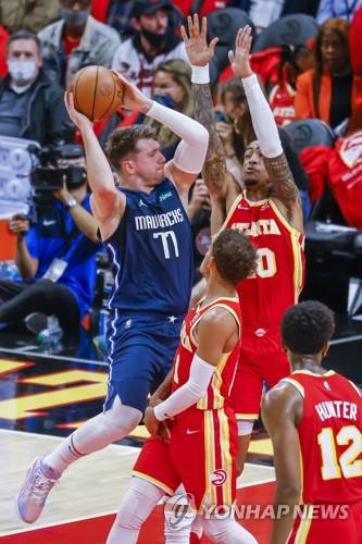 epa09538068 Dallas Mavericks guard Luka Doncic (L) of Slovenia in action against Atlanta Hawks forward John Collins (R) during the first half of the NBA basketball game between the Dallas Mavericks and the Atlanta Hawks at State Farm Arena in Atlanta, Georgia, USA, 21 October 2021. EPA/ERIK S. LESSER SHUTTERSTOCK OUT