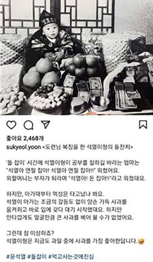 이에 앞서서는 자신의 인스타그램에 과거 돌잔치 때 사과를 잡고 있는 흑백사진과 함께 "석열이 아가는 돌잡이 때 양손 가득 사과를 움켜쥐고 바로 입에 갖다 대기 시작했대요. 그런데 참 이상하죠? 석열이 형은 지금도 과일 중에 사과를 가장 좋아한답니다"라는 글을 올리기도 했습니다.