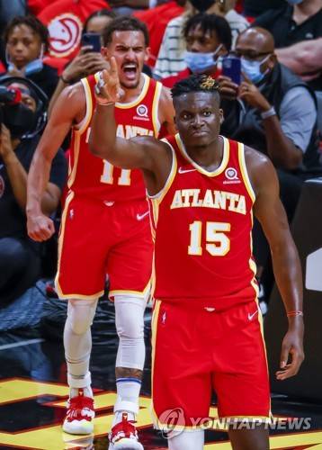 epa09538116 Atlanta Hawks center Clint Capela (R) of Switzerland and Atlanta Hawks guard Trae Young (L) react during the second half of the NBA basketball game between the Dallas Mavericks and the Atlanta Hawks at State Farm Arena in Atlanta, Georgia, USA, 21 October 2021. EPA/ERIK S. LESSER SHUTTERSTOCK OUT
