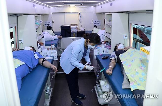 (고양=연합뉴스) 김병만 기자 = 최근 코로나19 장기화로 혈액 수급에 비상이 걸린 가운데 22일 경기도 고양시 국민건강보험 일산병원 의료진들이 단체헌혈에 동참하고 있다.
