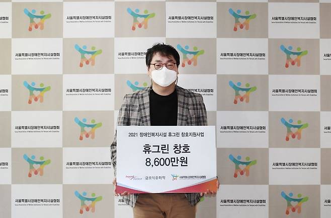 (서울=연합뉴스) 금호석유화학이 서울시장애인복지시설협회에 창호 교체 지원금 8천600만 원을 전달했다고 22일 밝혔다. 사진은 지원금 받고 기념 촬영하는 허곤 서울시장애인복지시설협회장. 2021.10.22